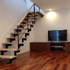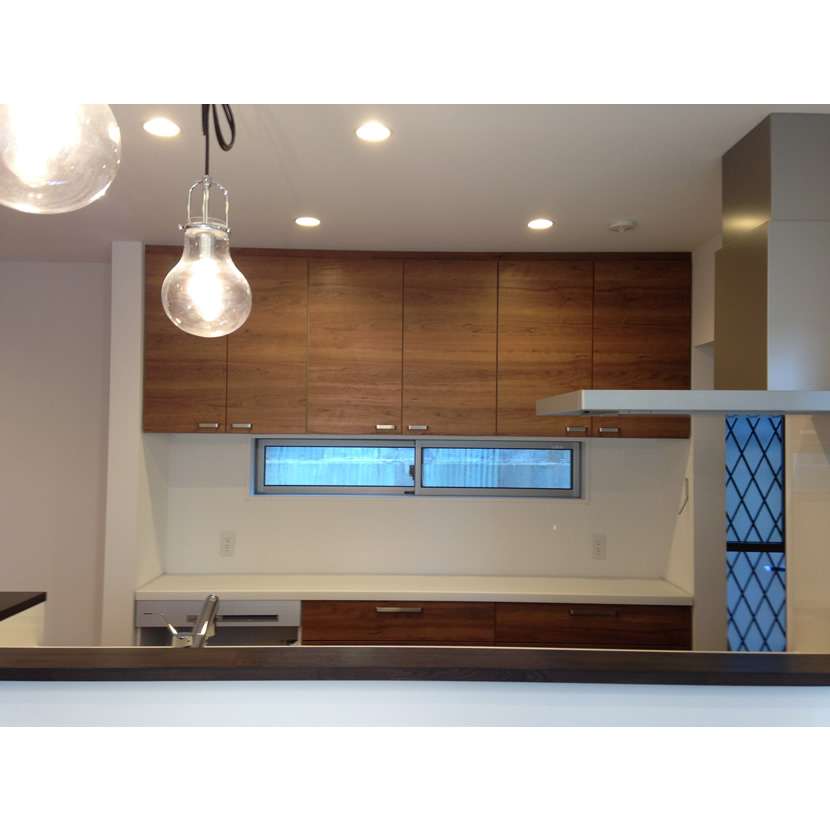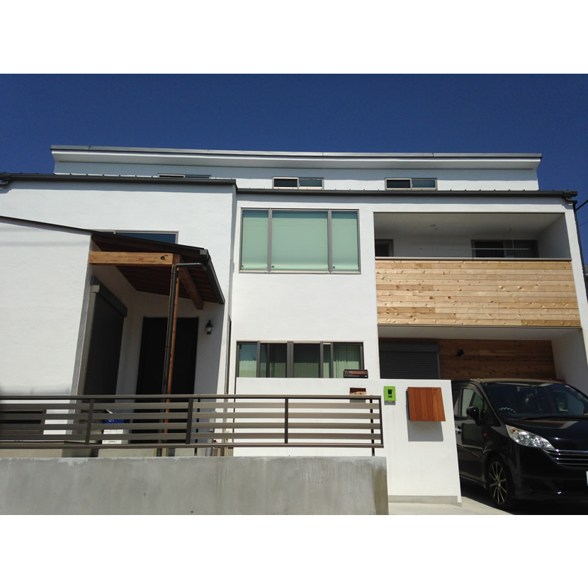 2階の吹抜け横をコモンスペース(お子様の勉強、旦那さんの仕事、趣味)としたことで、1階との緩やかなつながりを作り出しています。外観・内観の仕上げには木材を取り入れ、落ち着く空間を演出。リビングはインテリアのようなオープン階段でシンプルにまとめています。