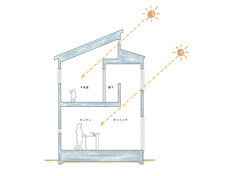 家の南側中央部の吹抜けと大きな窓を設ける事で、1階の奥まで柔らかい光が届くように設計。さらに、2階の子供部屋と主寝室の上部から光を取り込み、家の中全体に光がふりそそぐことをコンセプトとしています。